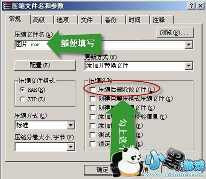 设置一个文件名,勾选“压缩后删除源文件”。然后点“高级”选项卡: