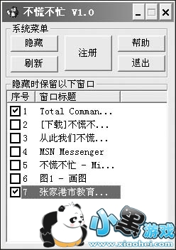 当安装了这款名为“不慌不忙”的小软件后,每当出现上面提到的紧急情况,只要同时按下鼠标的左、右键,桌面上所有打开的窗口会立即隐藏起来,这样我们就不用去人工瞄准并按下窗口右上方那个小的可怜的最小化按钮了,当危险解除时只要再次同时按下鼠标左、右键即可。