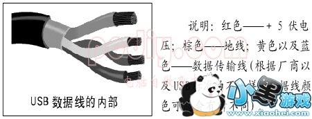 电脑上的USB接口是一个包含四条金手指引脚的扁平接口(如上图所示),如果我们剖开USB外设的数据线,可以发现其内部共有四条线,其中两条负责供电而另外两条负责数据的传输,如下图所示。