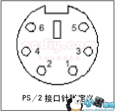 相信玩家们早已经没有使用COM端口的鼠标键盘了吧?现在我们使用的鼠标和键盘绝大多数采用PS/2接口,鼠标和键盘的PS/2接口的物理外观完全相同,初学者往往容易插错,以至于业界不得不在PC'99规范中用两种不同的颜色来将其区别开,而事实上它们在工作原理上是完全相同的,从下面的PS/2接口针脚定义我们就可以看出来。