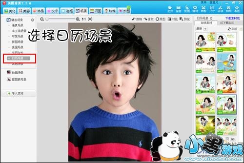 1、打开宝宝的照片。在新版美图秀秀的场景里有个新增的“日历场景”分类,点击一下就可以看到右侧的素材栏里有许多漂亮的日历效果了。