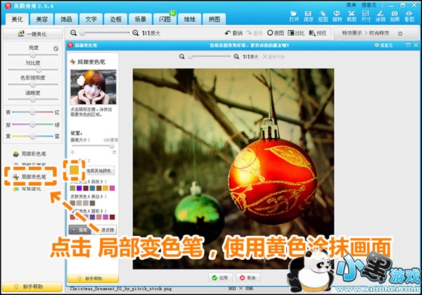 5.根据景物的特征,调整图片整体的色调,比如这是一个圣诞节的标志景物图,所以我们需要暖黄的色调。可以点击“局部变色笔”功能,选择黄色的画笔,在画面涂抹。