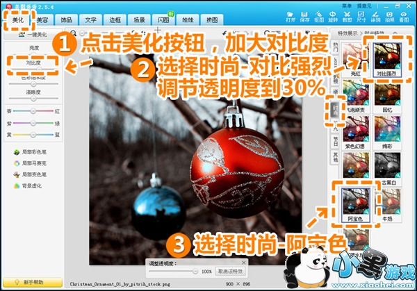 1.首先在软件下打开待处理的图片,进入“美化”菜单下,提高对比度;再选择“时尚”分类下的“对比强烈”特效,将透明度调节至30%左右;紧接着选择“阿宝色”,轻松变换色调。