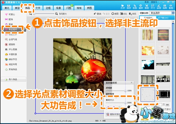 6.接着到“饰品”菜单下,在“非主流印”分类中,找到白色的光点素材,添加并调节素材的大小,让意境更加柔和些。
