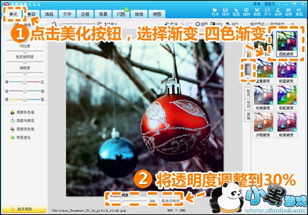 3.再返回到“美化”菜单下,选择渐变-四色渐变,将透明度调节到30%,丰富色彩。