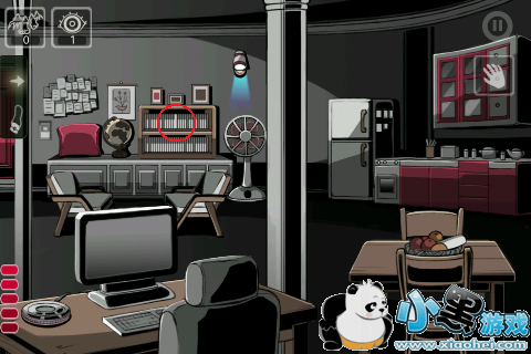 3.中间的房间,在地球仪叛变的木架上,有一条白色的竖线,点它可以得到一张CD。