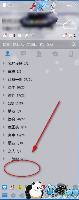 1、登录到自己的qq帐号以后,鼠标移动到qq面板上面的联系人处会出现一个下拉箭头,用鼠标点击下拉箭头