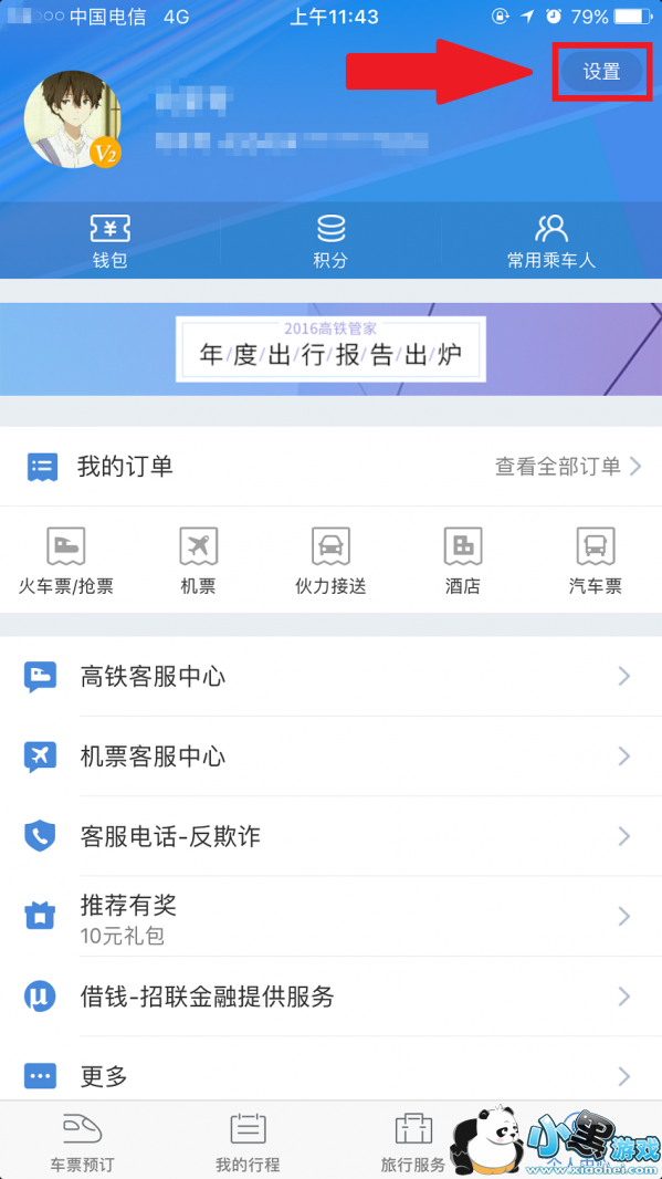 ①、打开高铁管家,点击右上角进入【设置】;