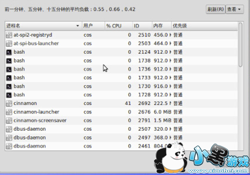 第十步:下图为系统监视器窗口,在进程分类下,可以看到每项进程的用户、CPU、ID、内容和优先级。