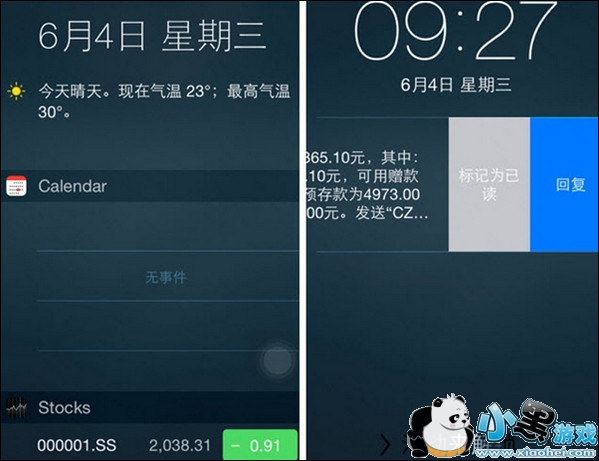 iOS8的通知中心和iOS7相比较,人性化程度更高。一方面是界面上的显示更有条理,每一项都有明显的间隔,天气也有了小图标,而且支持自定义编辑通知中心里的模块,可以把自己需要的一些通知组件加到这里来。iOS8相比iOS7来说通知中心里另一个智能的地方就在于,在锁屏界面下向左滑动即可选择将通知消息标记为已读,而且还可以在这个状态下直接回复消息;选择回复后,信息详情会显示在顶部,下面会有一个回复的文本框。这一功能可以说相当的方便,不用解锁就可完成简单的回复操作。