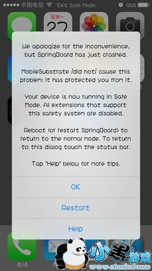 iOS7用户如果发现设备界面变成灰色,状态栏上显示“Exit Safe Mode”,并弹窗提示“We apologize for the inconvenience,but SpringBoard has just crashed. MobileSubstrate did not cause this problem:it has protected you from it.”那么“恭喜你”,你的设备已经进入安全模式。