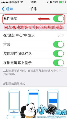 步骤2:向左拖动最上方“允许通知”的滑块,就可以关闭通知。也可以重新设置解锁后的提醒样式,这样就不会在锁屏状态下收到通知的文字提示了。