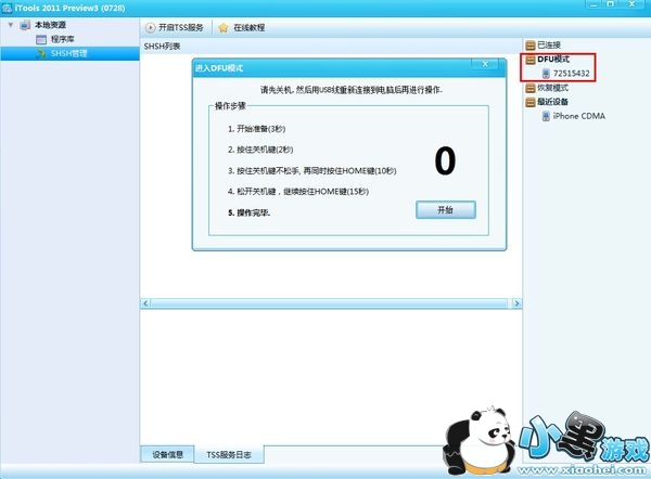 就在刚才那一步,点击【进入DFU模式】,先把弹出的窗口的操作提示全看一遍,不要到数秒的时候再看心慌手乱。看完后就可以点【开始】进行操作了。