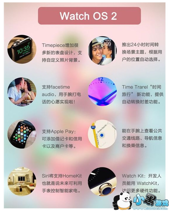 此外,新系统还加入了Time Travel功能,可以在旋转表冠时切换表盘展示信息;新系统还增加支持横屏显示,将Apple Watch侧放并进行充电,它就会自动进入床头钟模式。最后,Apple Watch可以回复邮件(语音方式)、进行FaceTime语音通话、独立连接耳机、WiFi等。HomeKit、Apple Pay也进驻到Apple Watch中。