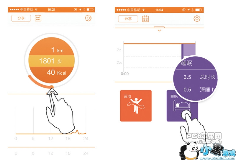 点击数据下方的三角符号,向上滑动主页面运动点击睡眠,即可查看睡眠质量。深紫色代表深度睡眠,浅紫色代表浅度睡眠。