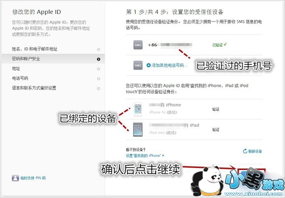13、验证通过后会显示该帐号所关联的设备,若无误点击继续;
