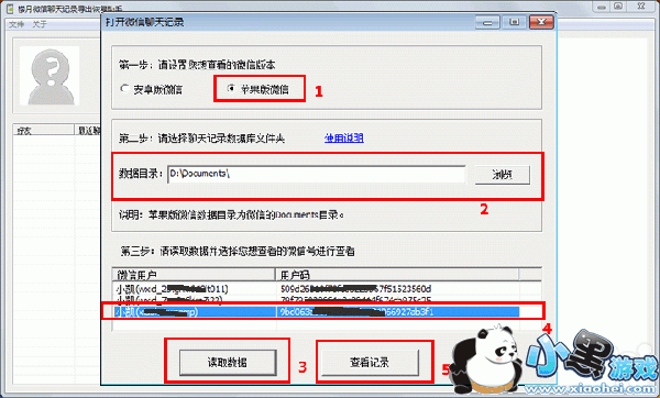 7. 打开“楼月微信聊天记录导出恢复助手”软件,设置微信版本为“苹果版微信”,数据目录选择我们刚才导出时所保存的“D:/Documents/”文件夹,然后点击“读取数据”按钮,界面将会显示该手机上所有登陆过的微信号码,我们选择一个想恢复聊天记录的微信号后点击“查看记录”按钮。