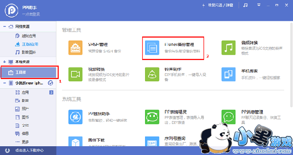3. 接下来我们打开“PP助手”软件,并点击左侧的“工具箱”,然后点击右侧的“备份管理”,如下图所示: