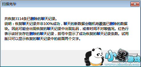 9. 稍等片刻后,软件将弹出窗口提示成功恢复的聊天记录条数,如下图所示,成功恢复了3114条已删除的微信聊天记录。