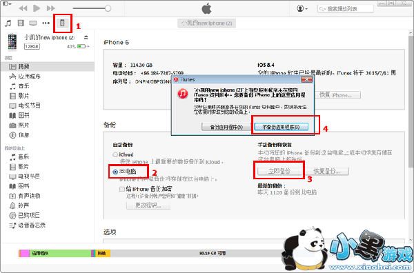 1. 我们需要先运行Itunes软件,并将手机与电脑进行连接,然后依次点击Itunes窗口左上角的手机图标,然后选择“本电脑”并点击“立即备份”按钮,然后在弹出的窗口中点击“不备份应用程序”,如下图所示,我们只需依次点击1,2,3,4处红框所标示的位置即可。