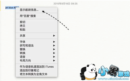 1、同样地,在当前 Mac 上最新的 OS X EL Capitan 系统也与 iOS9 一栏,支持直接查询航班信息。如下图所示,同样地我在备忘录中也输入一条想查查询的航班信息。
