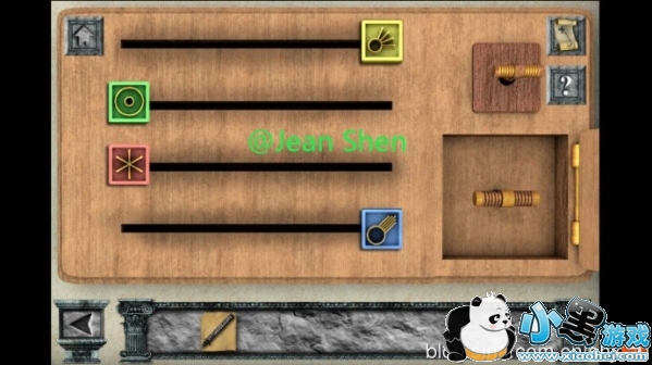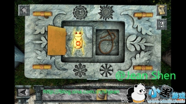 按照这个提示,调整山洞旁边的东西上的图案如下,得以打开黄色盖子,然后把之前从蘑菇上得到的虫,放进去,可以得到一根绳子;