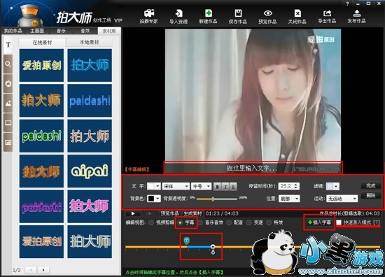 [字幕添加]如图2所示,还有一种添加文字的方式就是字幕,点击字幕,在时间轴上找到要插入字幕的位置(也可以使用快速录入模式,根据视频画面不同添加不同的字幕),然后点击插入字幕,就可以在此时插入字幕。字幕可以对字体,背景,透明度,位置,停留时间,滤镜,运动方式等进行设置。设置好了可以对视频进行整体预览。整体效果没有问题之后就可以保持视频发布到爱拍网和朋友一起分享吧。
