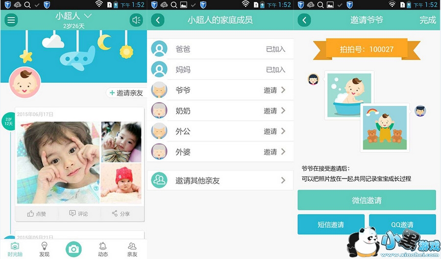 在宝宝主页有一个“邀请亲友”按钮,点击之后可以看到有“爸爸、妈妈、爷爷、奶奶、外公、外婆”,点击一个家人,如爷爷(考虑到老年人不太会使用微信或者qq,我们就选择用短信邀请他)将短信发送给爷爷之后,再教爷爷安装好亲子拍拍,同意您的邀请就可以了。以后宝爸宝妈们随时传照片,爷爷都能收到动态提醒。这样,远在外地的爷爷奶奶、外公外婆都可以第一时间查看宝宝照片了,宝宝的每一个变化他们都能及时知道,再也不用一年甚至多年才能见一次,不知不觉中宝宝就长大了。