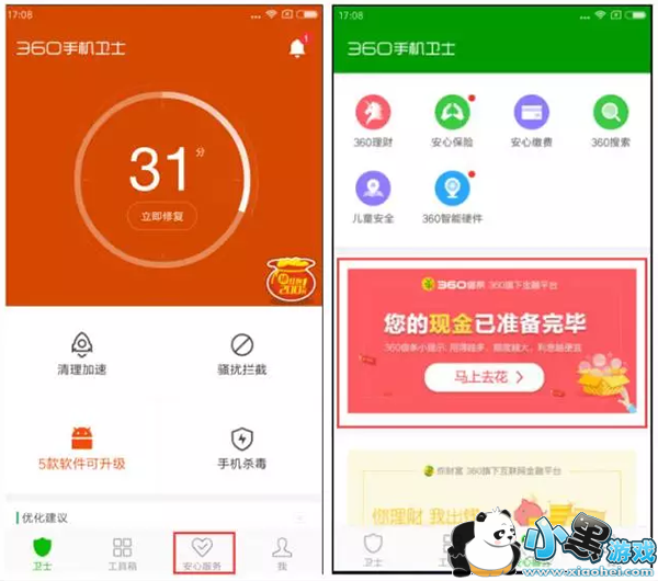 第一步:打开360手机卫士,点击”安心服务” 进入360借条