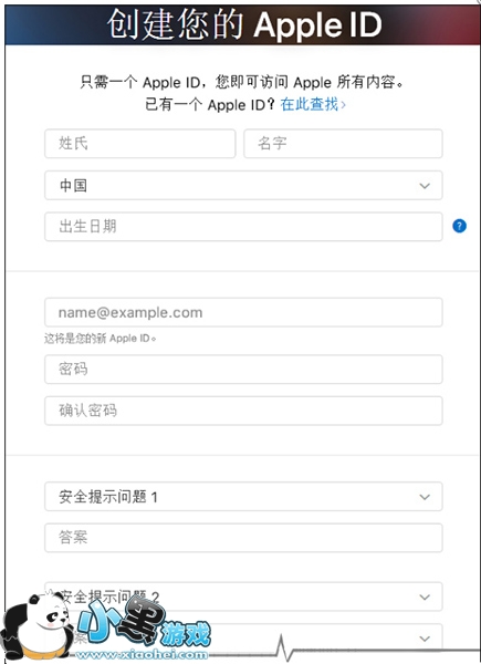 4、打开后创建Apple ID页面后,按提示输入对应的信息就可以成功注册了。