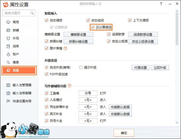 4、进入属性设置后,点击切换到“高级”选项卡,取消“云计算候选”的勾选状态,点击“确定”即可。