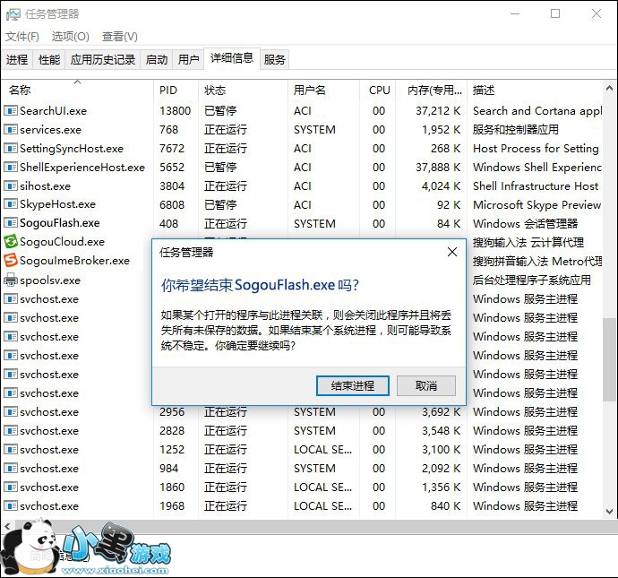 2、选中“SogouFlash.exe*32”进程后,点击“结束进程”,弹出提示再次点击“结束进程”;