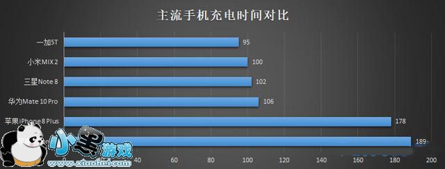 相比之下,小米MIX 2充满电量需要100分钟,三星Note 8需要102分钟,华为Mate 10 Pro需要106分钟,和一加5T差距不大。而苹果iPhone 8和iPhone X如果使用手机附送的原装充电线,则分别需要178分钟和189分钟的充电时间,耗时非常漫长。