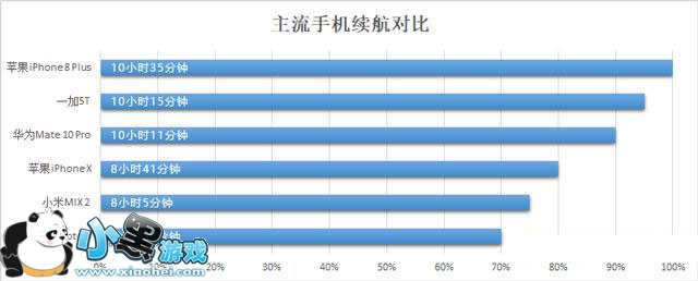 对比同期上市的高端智能手机(上图)会发现,苹果iPhone 8 Plus的续航表现最好,亮屏时间为10小时35分钟;其次是一加5T,亮屏时间为10小时15分钟;华为Mate 10 Pro也达到了10小时11分钟。苹果iPhone X、小米MIX 2、三星Note 8三款手机的亮屏时间分别为8小时41分钟、8小时5分钟、7小时50分钟。