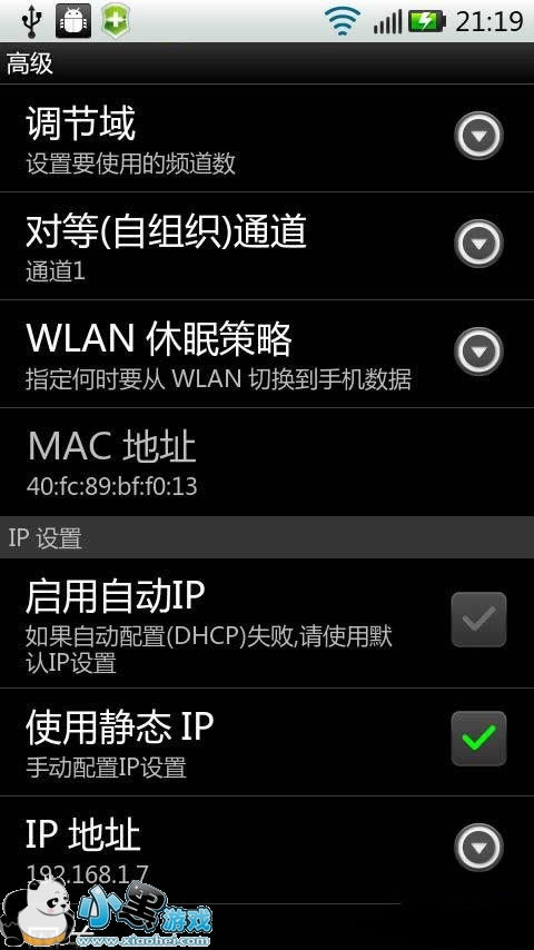 如果你不想开路由器的DHCP,也可以在I9100里设定固定IP,具体方法是进入“设置”里的“无线及网络”,然后进“WLAN配置”,点设置健,然后选“高级”,最后点“使用静态IP”。