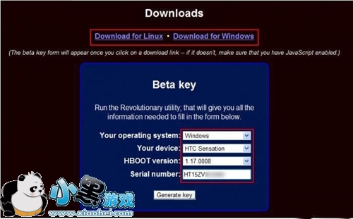2、点击下载链接时,同时还会出现一个Beta key对话框,选择系统版本、手机型号、HBOOT版本号,然后再填入 S/N码