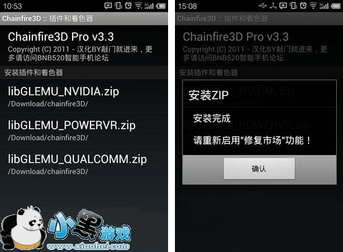 要使用Chainfire3D的模拟GPU功能,我们需要安装相应的图形插件。点击“安装插件/着色”,Chainfire3D即会自动搜索SD卡内的 插件,三个插件分别对应三种常见的GPU,点击安装即可。安装后会提示需要修复市场,这是因为Chainfire3D的插件会改变Android设备的 GPU识别码,导致市场某些应用无法适配机器。如果你发现平时找的应用找不到了,那就修复一下吧。注意,如果要卸载Chainfire3D或者CF3D驱 动,记得先卸载这些插件。