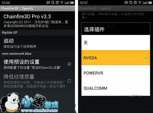 我们首先需要把手机root 掉,然后安装Chainfire3D的主程序,再安装Chainfire3D的授权密钥,就能够使用高级版了(密钥的APK在插件的压缩包内)。此外,要 发挥Chainfire3D的功效,Chainfire3D插件也必不可少。Chainfire3D共有三个插件,分别对应NV Tegra、高通和PowerVR的GPU,将zip后缀的插件放在SD卡任意目录下即可。