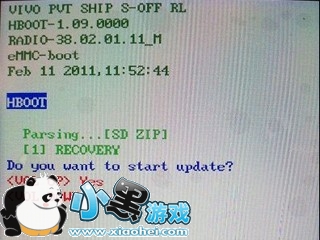 4、然后取出电池进入Hboot界面,手机会自动检测出更新,然后问你是否进行更新,按音量+确认更新。