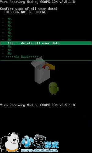 3、选择Wipe DATA/Factory reset(中文版:清空DATA恢复出厂设置),然后再选择delete all user data(中文版:删除全部用户数据)