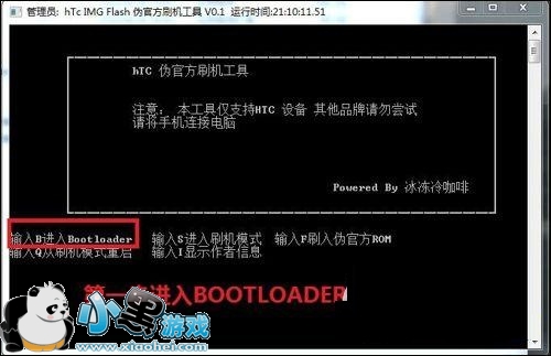 2.运行HTC 伪官方刷机工具,然后第一步则是先进入bootloader界面。输入B就可以进行bootloader界面,当然你也可以手动进入,具体的就是按住【电源】和【音量减】进入hboot。