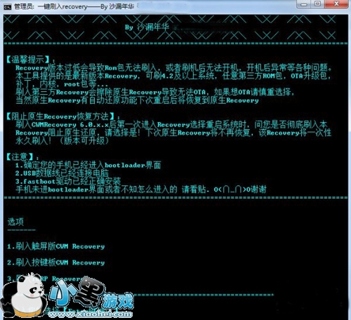 2.本工具包含三个版本的Recovery,分别为最新 ClockWorkMod Recovery 6.0.2.0触屏版,最新 ClockWorkMod Recovery 6.0.2.0按键版,最新 TWRPRecovery 2.3.2.3,请根据需要选择不同版本,之后按回车自动刷入。