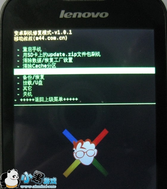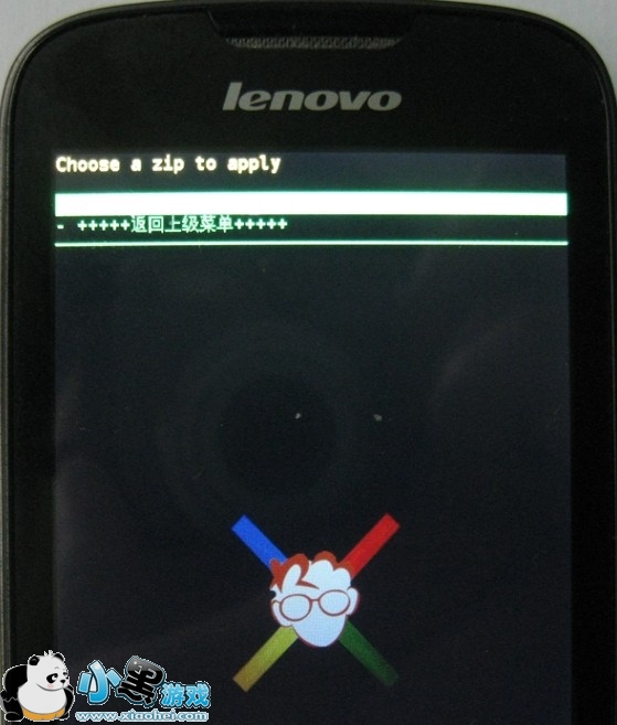 出现新的界面后,再次将高亮条移动到第“用SD卡上的ZIP文件包刷机”上,并按电源键确认;