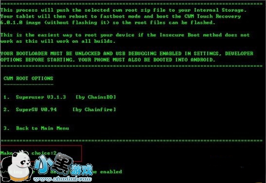 然后再输入“2”回车。在这之前最好先把supersu.0.98.zip拷到nexus7的根目录。还有就是这个时候nexus7要以ADB模式连接电脑。也就是开机连接。这点很重要不然无法成功