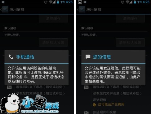当然,如果不知道权限的具体作用,可以通过点击权限条目显示详细的权限解释,对于提示“可能会产生费用”的权限,还会说出恶意程序如何进行扣费详解。可以说Android4.2.2的应用安装权限设计,已经很好的为用户规避了吸费应用。