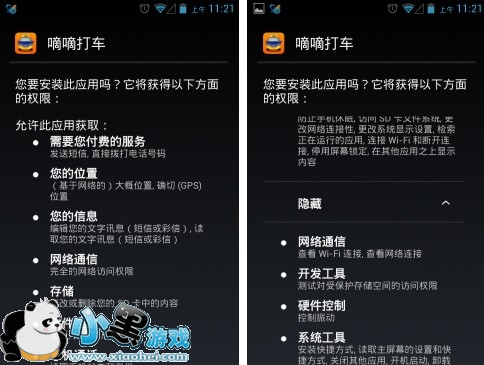 随着Android系统安全性问题的日益滋生,Android系统在安装应用时对于权限的标注越来越明确、详细,Android4.1系统在安装应用时将应用权限分为两级显示模式,第一级为比较全面的权限列表;第二级为不重要的权限列表,通常这一列表处于隐藏状态。