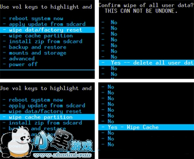 在recovery的主界面按音量键 选择 Wipe data/factory reset,确认 选择 Yes —— delete all user date,确认,等待完成。在recovery的主界面按音量键 选择 Wipe cache partition,确认 选择 Yes – Wipe Cache,确认,等待完成。