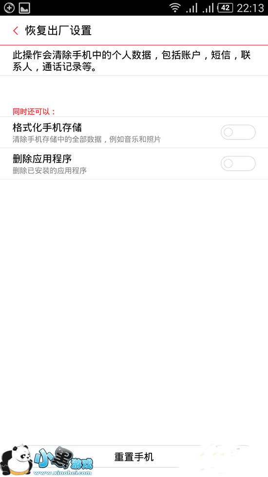 进入恢复出厂设置界面,会让选择格式化手机存储和删除应用程序,这个可以根据个人需要打勾选择,如图: