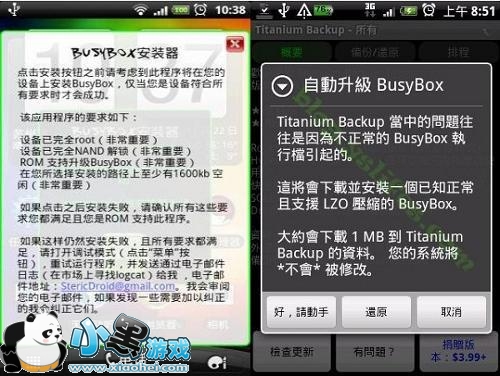 没有BusyBox的请先下载busybox.apk并安装(下载),安装BusyBox很简单,就是照平常安装App一样,只是App后要设置一下,执行BusyBox选【Install】,完成后【SmartInstall】再等完成OK退出(期间出现提示框请叉走)。