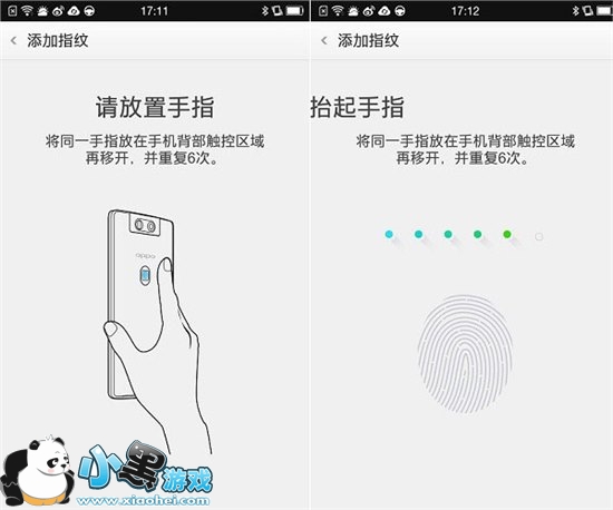 二、之后进入指纹设置,然后点击进入【添加指纹】,然后按照提示完成指纹录入。首先是将需要录入指纹的手指放在手机背部指纹触控区域,再移开,重复6次。完成后,接下来进入“抬起手指”操作,将同一手指放在手机背部的触控区域再移开,同样重复6次,如下图示意图所示。